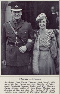 Margaret Carter was born in 1905 at U.S.A.2 She was the daughter of Ray Carter.1 She married, firstly, John Eaton Monins, son of John Henry Monins and Edith Julia Cobbold, in 1926 at St. Louis, Missouri, U.S.A.1,2 She married, secondly, John Harvey Thursby, son of Reverend Harvey William Gustavus Thursby and Margaret Emily Mount, in November 1940 at St. Mary's Parish Church, Burghfield, Berkshire, England.1,2 She married, thirdly, Arthur Victor Agar-Robartes, 8th Viscount Clifden of Gowran, son of Thomas Charles Reginald Agar-Robartes, 6th Viscount Clifden of Gowran and Mary Dickenson, on 29 January 1948.1 She died in 1982.2